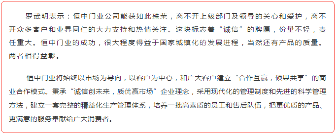 二要当好典型示范。要从严要求,自我加压,引导和带动全市更多单位树立起诚信经营、优质服务的理念,在全社会营造出崇尚诚信、践行诚信的良好氛围,努力成为全市企业传播诚信经营的重要窗口、践行社会主义核心价值观的重要阵地。