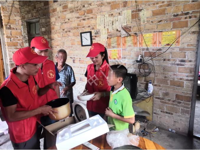 志愿者们顶着烈日,将月饼、大米、电饭煲、学习用品、衣服等爱心慰问物资一份份地往贫困学生家中送去。
