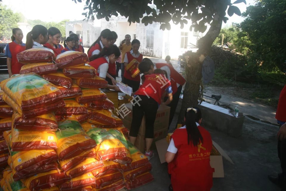 恒中门业志愿者们,积极地为村民发放爱心粮食
